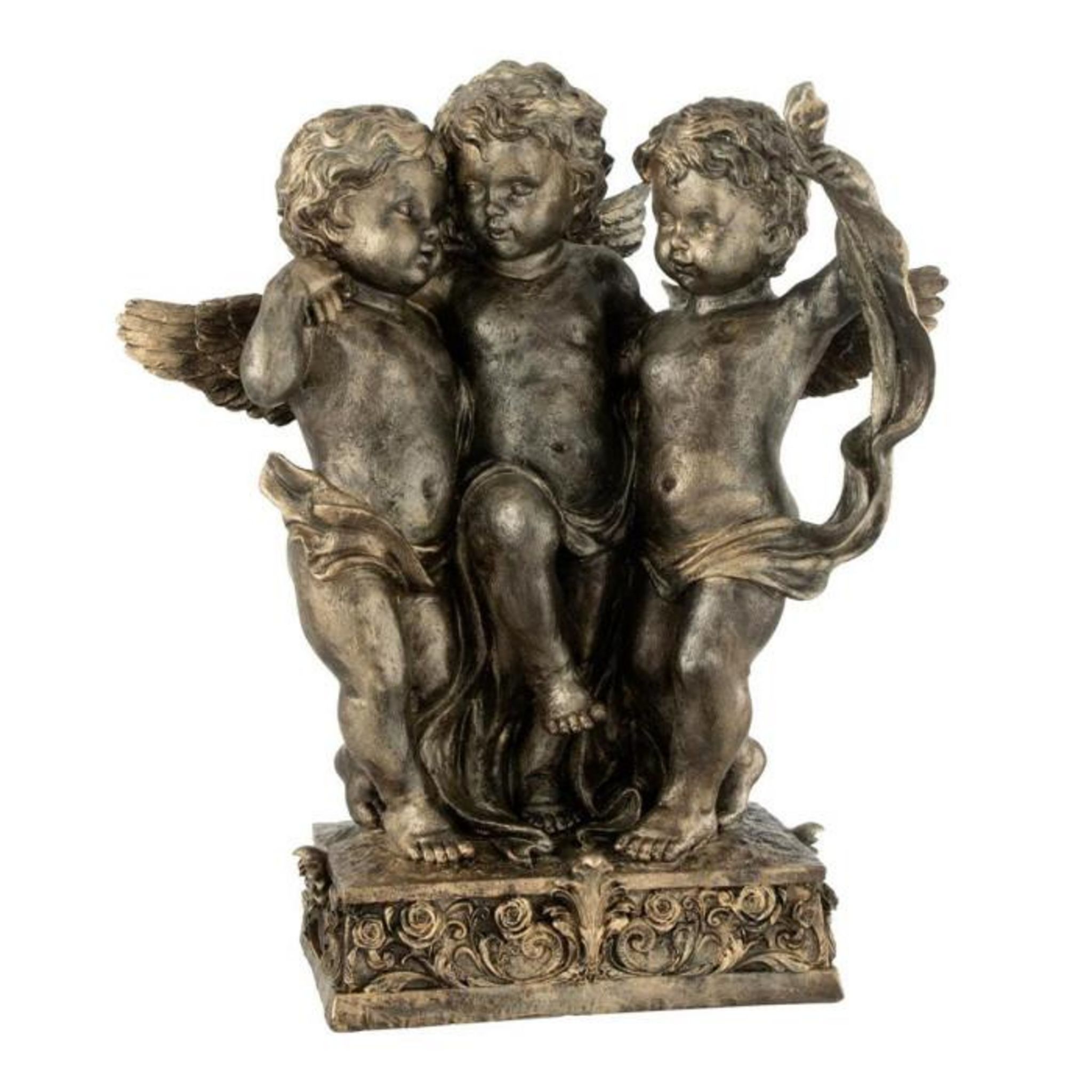 Informations Techniques : Dimensions : L. 42,5 x l. 22,5 x H. 46,5 cm Matières : 55% Chaux (Poudre) & 45% Résine Spécificités : Utile & Originale Statue déco 3 anges en accolade Poids : 2,13 kg Couleur : Bronze