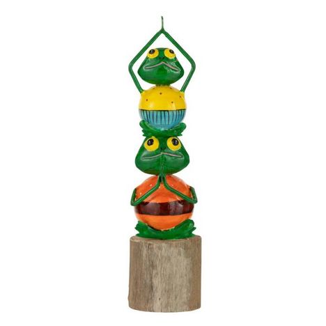 Informations Techniques : Dimensions : L. 9 x l. 8 x H. 31 cm Matières : 80% Métal & 20% Bois (Eucalyptus) Spécificités : Originale & Déco Pyramide de grenouille Sur pied Vendue à l'unité Poids : 0,45 kg Couleur : Multicolore