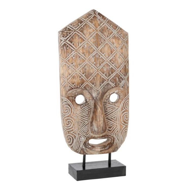 Informations Techniques : Dimensions : L. 26 x l. 10 x H. 60 cm Matière : Bois (Alabasia) Spécificités : Tendance & Moderne Statuette Déco Sur Pied Design Masque Primitif Style Africain Poids : 1,35 kg Couleur : Naturel, Blanc & Noir