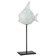 Informations Techniques : Dimensions : L. 16 x l. 13 x H. 37 cm Matière : Verre Spécificités : Tendance & Moderne Statuette Déco Sur Pied Design Poisson Poids : 1,59 kg Couleur : Blanc, Or & Noir