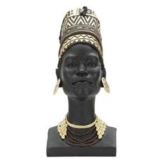 Informations Techniques : Dimensions : L. 21,5 x l. 27,5 x H. 45 cm Matière : Polyrésine Spécificités : Déco & Traditionnelle Statuette tête femme Avec coiffe et bijoux Poids : 2,3 kg Couleur : Noir