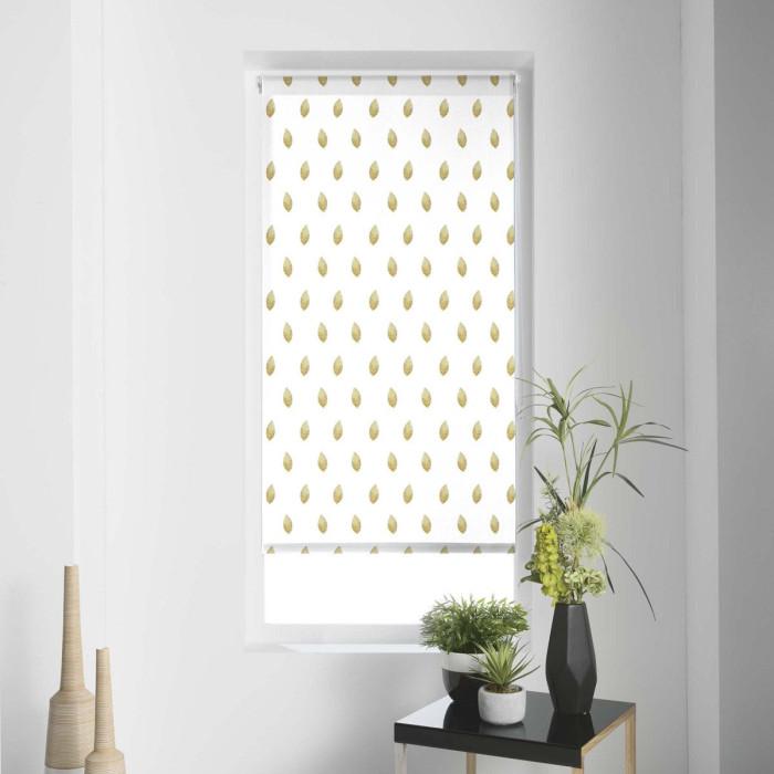 Informations Techniques : Dimensions : L. 120 x H. 180 cm Matière : Polyester Spécificités : Élégant & Design Effet tamisant Imprimé feuilles d'or Enrouleur Poids : 0,67 kg Couleur : Blanc
