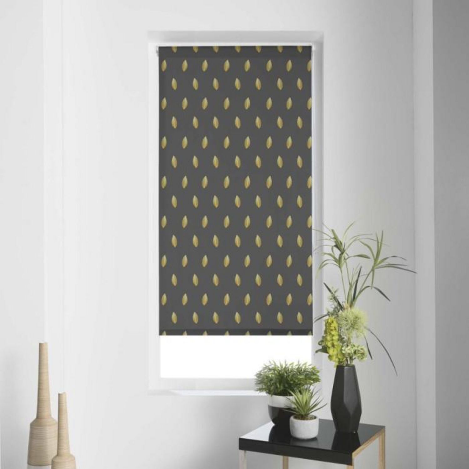 Informations Techniques : Dimensions : L. 90 x H. 180 cm Matière : Polyester Spécificités : Élégant & Design Effet tamisant Motif: Feuilles d'or Enrouleur Couleur : Anthracite