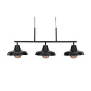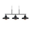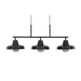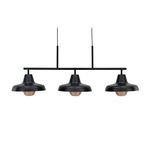 Informations Techniques : Dimensions : L. 112 x l. 30 x H. 48 cm Lampe : D. 30cm Matières : Acier & PVC Spécificités : Pratique & Tendance Suspension design Avec 3 lampes Hauteur réglable Style industriel Ampoules non incluses Douille : E27 Poids : 5 kg Couleur : Noir
