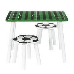 Informations Techniques : Dimensions : Table : L. 60 x l. 40 x H. 45 cm Tabourets: D. 25 x H. 25 cm Matières : Assise : MDF Plateau : MDF Piètement : Bois (Pin) Spécificités : Pratique & Amusante Table enfant avec 2 tabourets Table motif terrain de foot Tabouret motif ballon de foot À monter soi-m