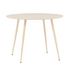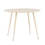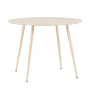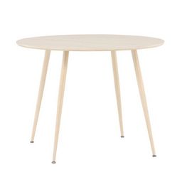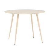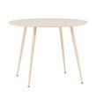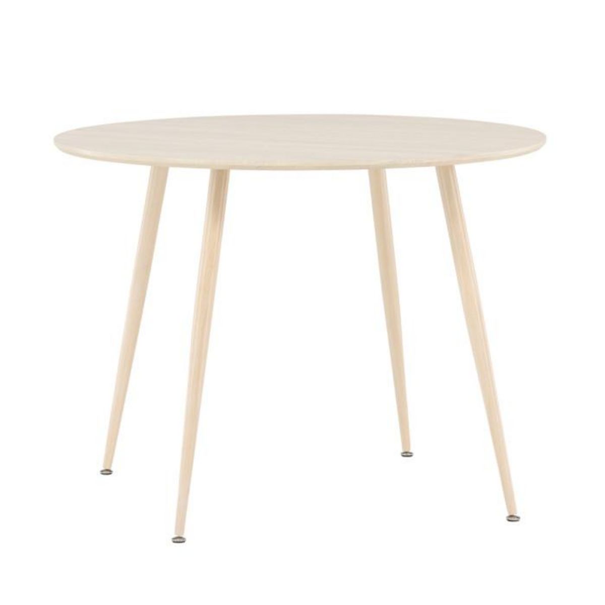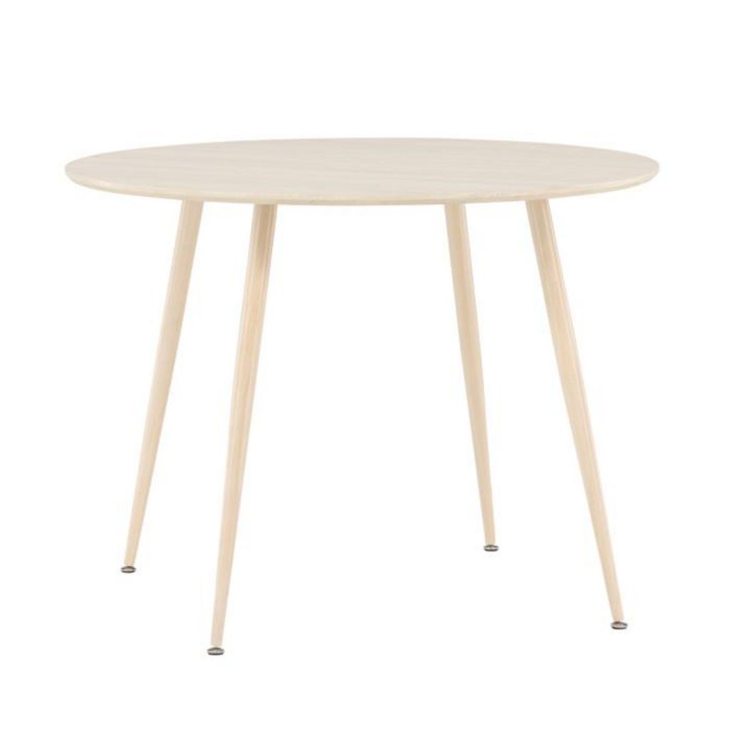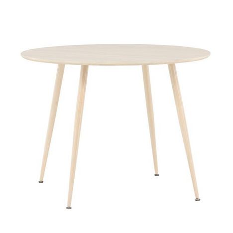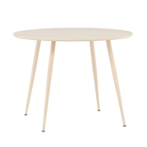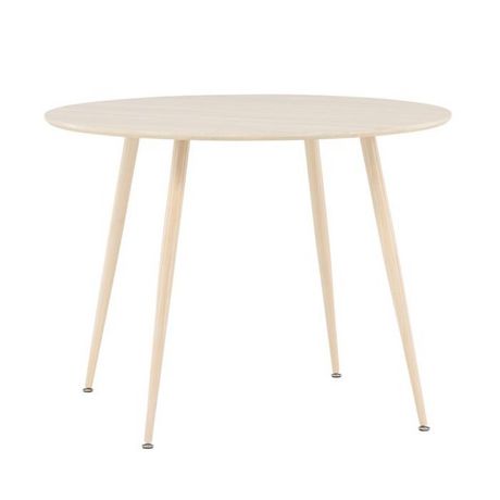 Informations Techniques : Dimensions : D. 100 x H. 75 cm Matières : Plateau : MDF Piètement : Acier Spécificités : Pratique & Tendance Table à manger design Jusqu'à 4 couverts Pieds effet bois blanchi à la chaux Nombre de colis : 2 Poids max supporté : 50 kg Poids : 13,4 kg Couleur : Naturel