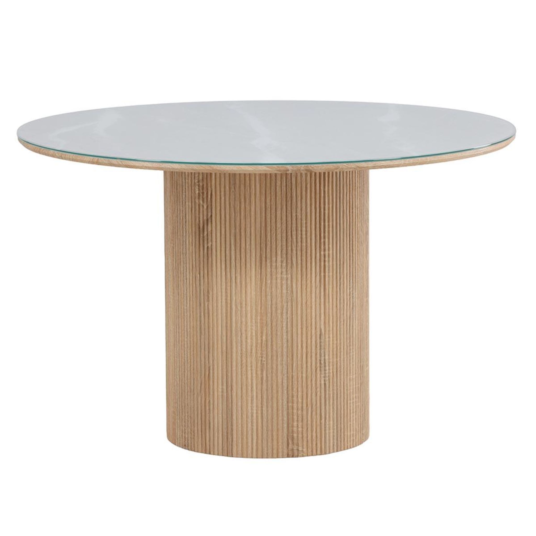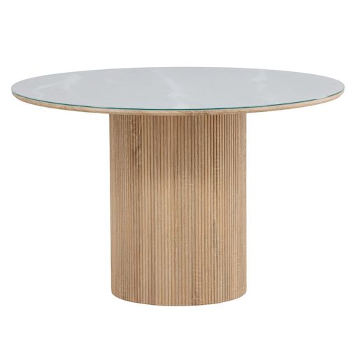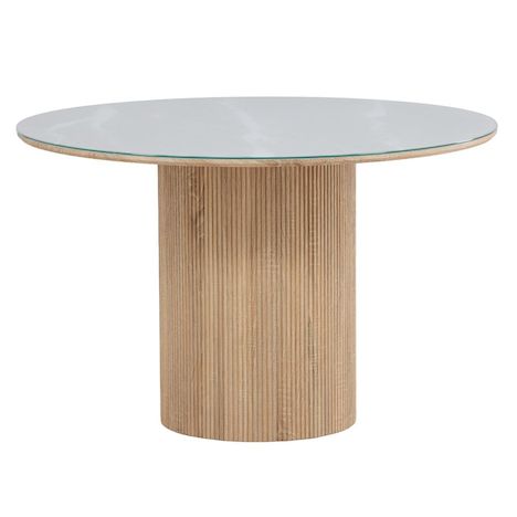 Informations Techniques : Dimensions : D. 120 x H. 75 cm Plateau : H. 2 cm Matières : Plateau : Verre Piètement : MDF Spécificités : Élégante & Moderne Table à manger ronde Jusqu'à 4/6 couverts Plateau en verre Pied cylindrique cannelé Certifiée FSC Nombre de colis : 2 Poids max supporté : 100 kg
