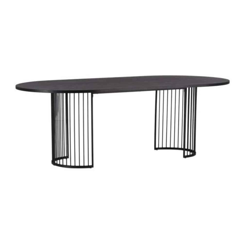 Informations Techniques : Dimensions : L. 220 x l. 110 x H. 75 cm Plateau : H. 1,8 cm Matières : Plateau : MDF & Placage Piètement : Acier Spécificités : Pratique & Tendance Table à manger design Jusqu'à 8 couverts Pieds de table en demi cercle Forme ovale Poids max supporté : 80 kg Poids : 57,50
