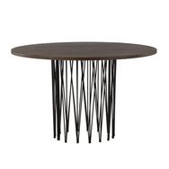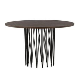 Informations Techniques : Dimensions : D. 120 x H. 74 cm Plateau : H. 2,5 cm Matières : Plateau : Placage, MDF Piètement : Acier Spécificités : Pratique & Tendance Table à manger design Jusqu'à 6 couverts Pied central décoratif Finition du pied laquée et poudre noir Forme ronde Nombre de colis : 2