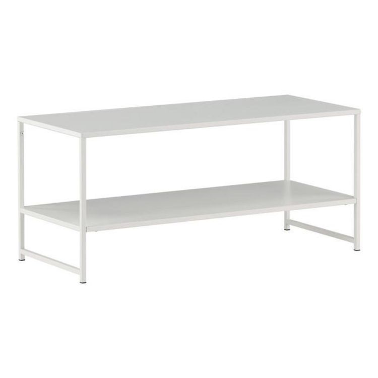 Informations Techniques : Dimensions : L. 102 x l. 43 x H. 45 cm Plateau : H. 1,5 cm Matière : Acier Spécificités : Moderne & Pratique Table basse avec étagère Revêtement en poudre Nombre de colis : 1 Poids max supporté : 10 kg Poids : 7 kg Couleur : Blanc