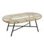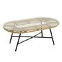 Informations Techniques : Dimensions : L. 90 x l. 50 x H. 35 cm Matières : Métal & Verre Spécificités : Tendance & Moderne Table Basse Forme Ovale Convient à un Usage Extérieur Capacité Portante : 35 kg A monter soi-même Poids : 8,6 kg Couleur : Naturel & Noir