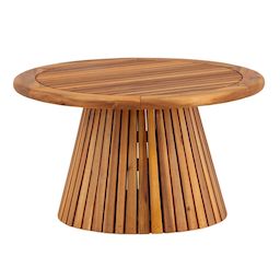 Informations Techniques : Dimensions : D. 70 x H. 40 cm Plateau : H. 2,2 cm Matière : Bois (Acacia) Spécificités : Intemporelle & Robuste Table basse d'extérieur Design nervuré Structure cylindrique Poids max supporté : 50 kg Poids : 9 kg Couleur : Naturel
