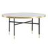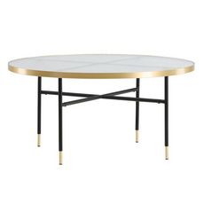 Informations Techniques : Dimensions : D. 98 x H. 48 cm Matières : Acier & Verre Spécificités : Élégante & Tendance Table basse design Plateau en verre à motifs Revêtement en poudre noir mat et laiton Nombre de colis : 1 Poids max supporté : 50 kg Poids : 15,45 kg Couleur : Or & Noir