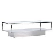 Informations Techniques : Dimensions : L. 130 x l. 60 x H. 38 cm Plateau : H. 0,5 cm Matières : Verre & Acier Spécificités : Design & Moderne Table basse rectangulaire Plateau en verre Cadre en acier argenté Nombre de colis : 1 Poids max supporté : 30 kg Poids : 32 kg Couleur : Argent & Transparent