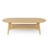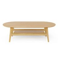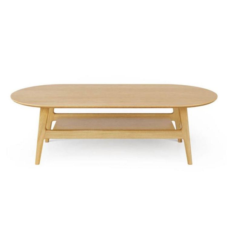 Informations Techniques : Dimensions : L. 130 x l. 60 x H. 39 cm Matières : MDF Piètement : Bois massif (Chêne) Spécificités : Pratique & Déco Table basse avec étagère Placage chêne Forme ovale Poids : 21 kg Couleur : Chêne