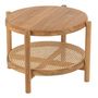 Informations Techniques : Dimensions : D. 68 x H. 46 cm Matières : 85% Bois (Teck) & 15% Rotin Spécificités : Chic & Utile Table d'appoint ronde Avec étagère en rotin Plateau en teck Poids max supporté : 120 kg Poids : 8,55 kg Couleur : Or