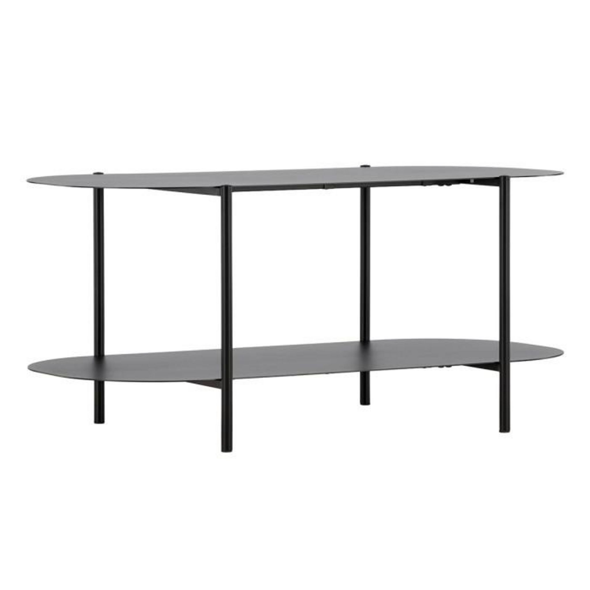 Informations Techniques : Dimensions : L. 100 x l. 50 x H. 45 cm Plateau : H. 1 cm Matière : Acier Spécificités : Moderne & Élégante Table basse ovale Avec étagère Revêtement en poudre époxy Nombre de colis : 1 Poids max supporté : 25 kg Poids : 14 kg Couleur : Noir
