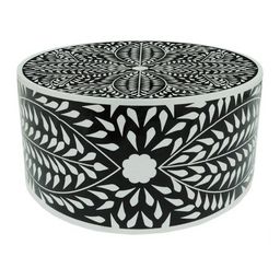Informations Techniques : Dimensions : L. 66 x l. 66 x H. 43 cm Matières : Bois & Métal Spécificités : Pratique & Tendance Table basse design Style arty Motif floral Forme ronde Nombre de colis : 1 Poids : 9,4 kg Couleur : Noir & Blanc