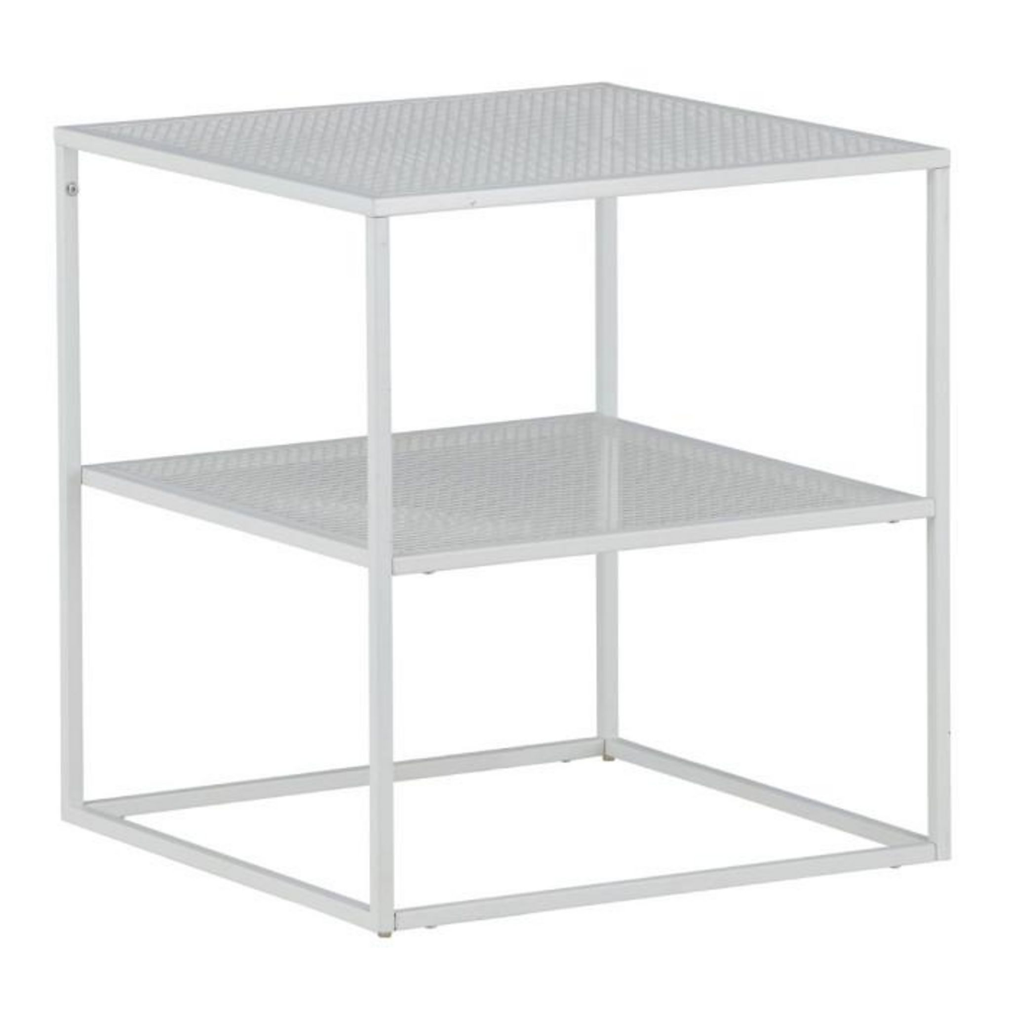 Informations Techniques : Dimensions : L. 55 x l. 55 x H. 60 cm Plateau : H. 1,5 cm Matière : Acier Spécificités : Moderne & Pratique Table d'appoint carré Design ajouré Avec étagère Revêtement en poudre de résine époxy Nombre de colis : 1 Poids max supporté : 10 kg Poids : 5 kg Couleur : Blanc