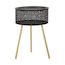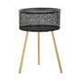 Informations Techniques : Dimensions : L. 35 x l. 35 x H. 50 cm Panier : D. 33 x H. 15 cm Matière : Métal Spécificités : Pratique & Utile Table d'appoint ronde Avec panier de rangement Design ajouré Piètement à assembler soi-même Poids : 2 kg Couleur : Noir & Or