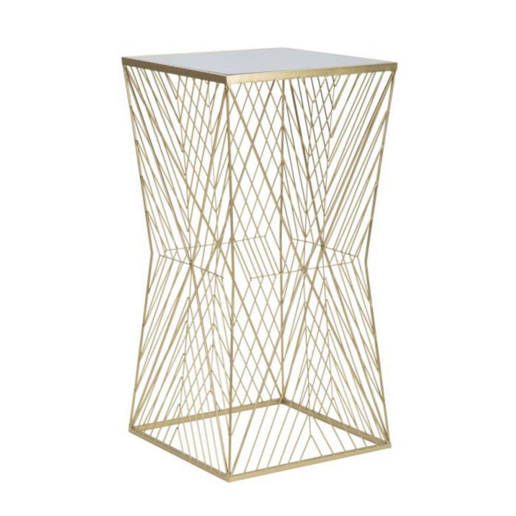 Informations Techniques : Dimensions : L. 50 x l. 50 x H. 100 cm Matières : Plateau : Verre Piètement : Métal Spécificités : Pratique & Déco Table d'appoint design Plateau en verre miroir Piètement design géométrique Poids : 11 kg Couleur : Or