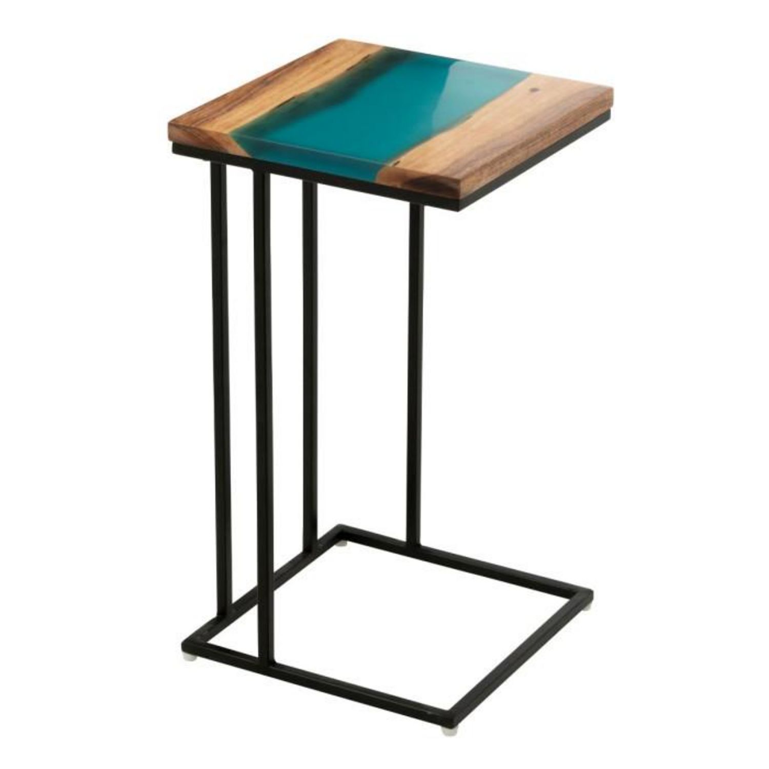 Informations Techniques : Dimensions : L. 31 x l. 31 x H. 55,88 cm Matières : 60% Métal, 30% Bois & 10% Résine Spécificités : Moderne & Utile Table d'appoint carrée Plateau en bois bicolore Poids max supporté : 60 kg Poids : 3,7 kg Couleur : Naturel & Bleu