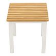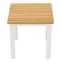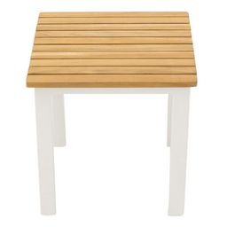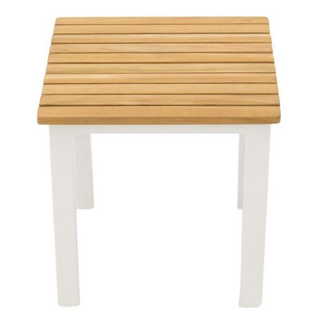 Informations Techniques : Dimensions : L. 40 x l. 40 x H. 40 cm Matières : Bois (Teck) & Aluminium Spécificités : Robuste & Pratique Table d'appoint carrée Plateau en bois Revêtement en poudre Poids max supporté : 30 kg Poids : 7 kg Couleur : Naturel & Blanc