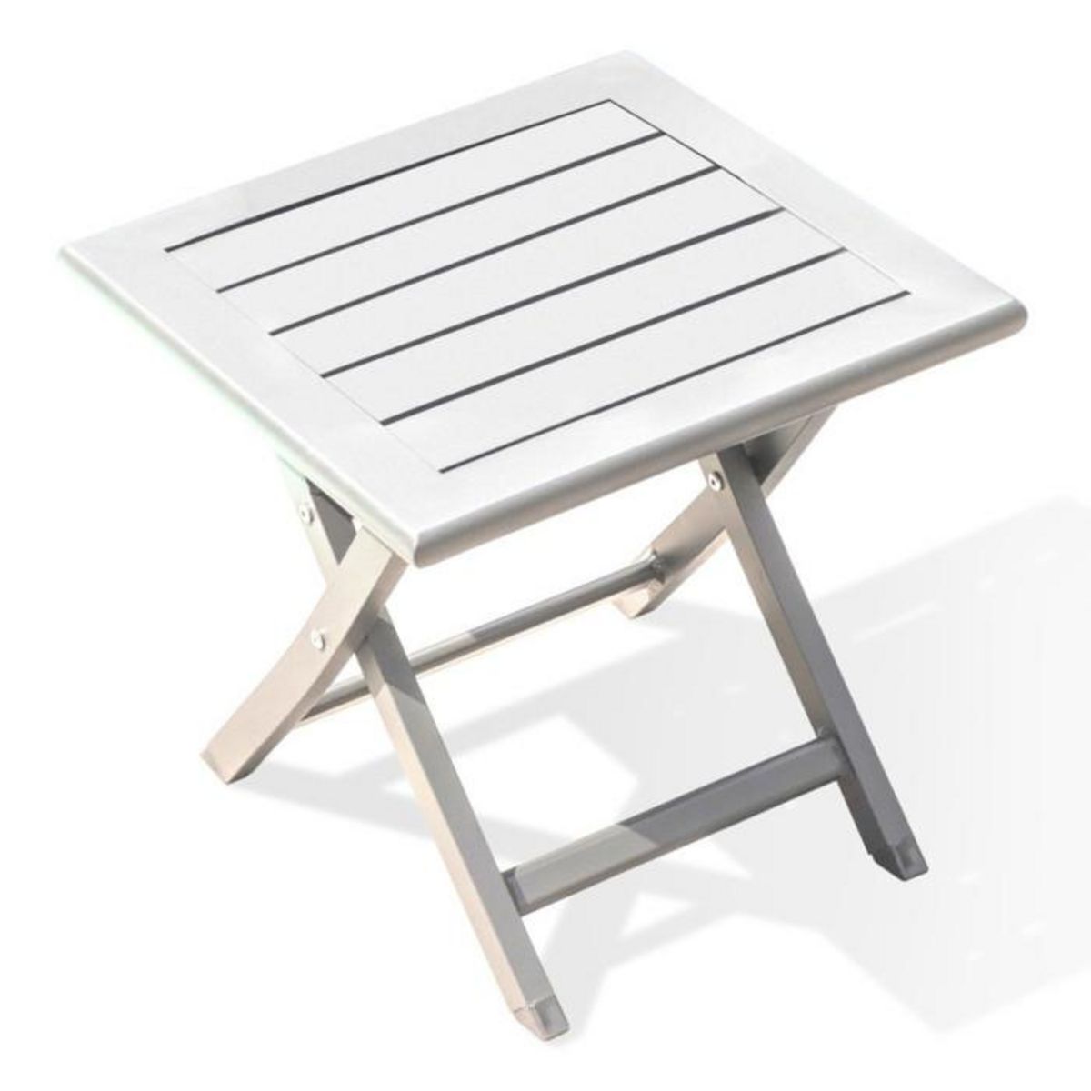 Informations Techniques : Dimensions : Dépliée : L. 43 x l. 43 x H. 40 cm Pliée : L. 43 x l. 14 x H. 56 cm Matière : Aluminium Spécificités : Légère & Compacte Table d'appoint d'extérieur pliante Forme carrée Nombre de colis : 1 Poids : 2,5 kg Couleur : Blanc