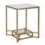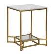 Informations Techniques : Dimensions : L. 47 x l. 47 x H. 60 cm Matières : Métal & Verre Spécificités : Pratique & Tendance Table d'appoint carrée Plateau supérieur effet marbre Étagère inférieur en verre transparent Poids : 7 kg Couleur : Or & Blanc