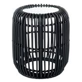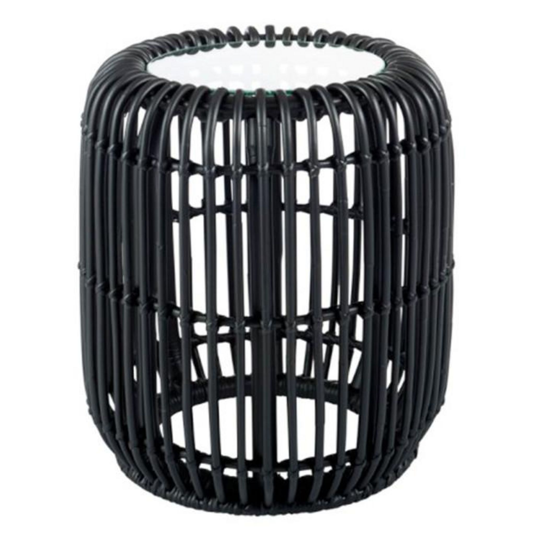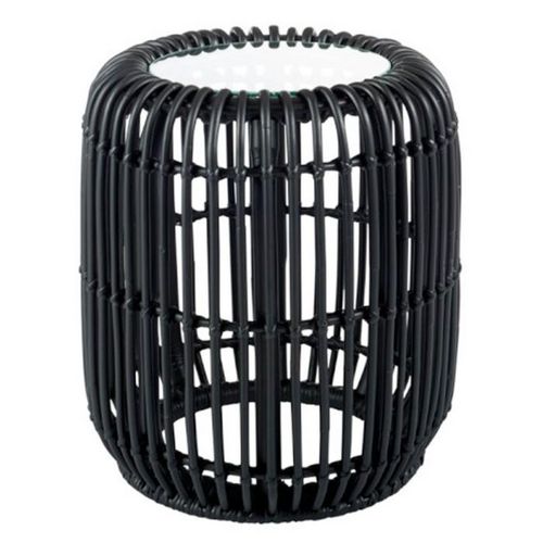 Bout de canapé rond en rotin tressé noir et dessus verre.