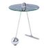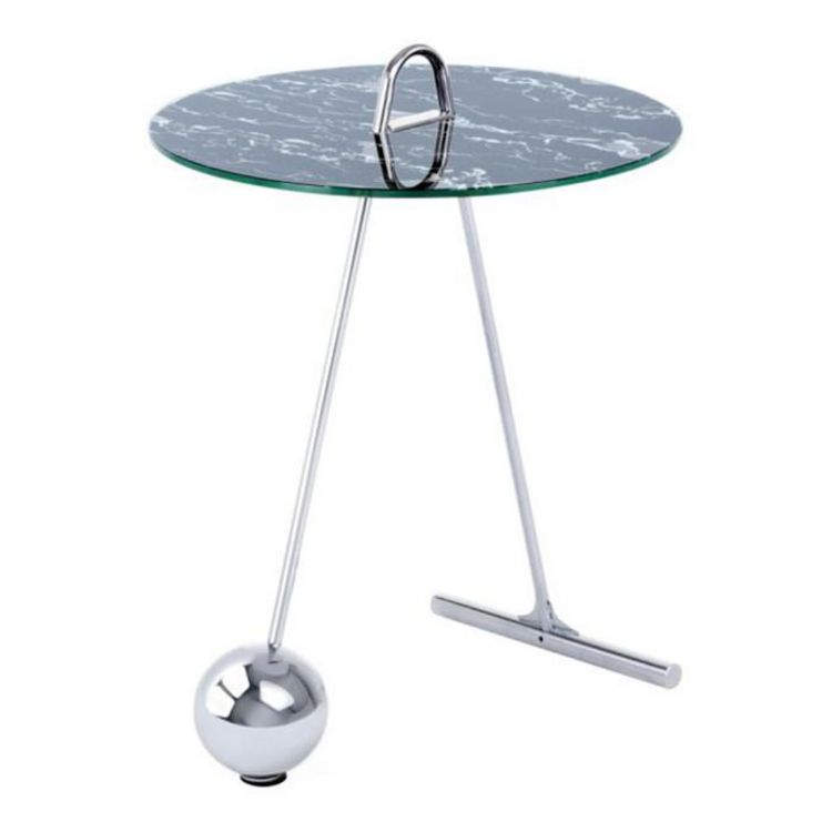Informations Techniques : Dimensions : D. 46 x H. 60 cm Épaisseur du plateau : 8 mm Matières : Acier & Verre Spécificités : Tendance & Moderne Table d'Appoint design Plateau en Verre aspect Marbre Pieds Forme Pendule en Métal Forme Ronde Portable sur Châssis Surface Lisse Capacité de Charge Maximale