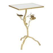 Informations Techniques : Dimensions : L. 40 x l. 30 x H. 60 cm Plateau : L. 38 x l. 27,5 cm Matières : Métal, MDF & Verre Spécificités : Pratique & Originale Table d'appoint rectangulaire Piètement design arbre Plateau en miroir Poids : 2,5 kg Couleur : Or