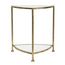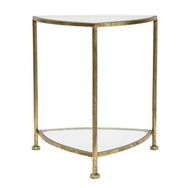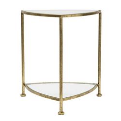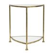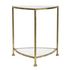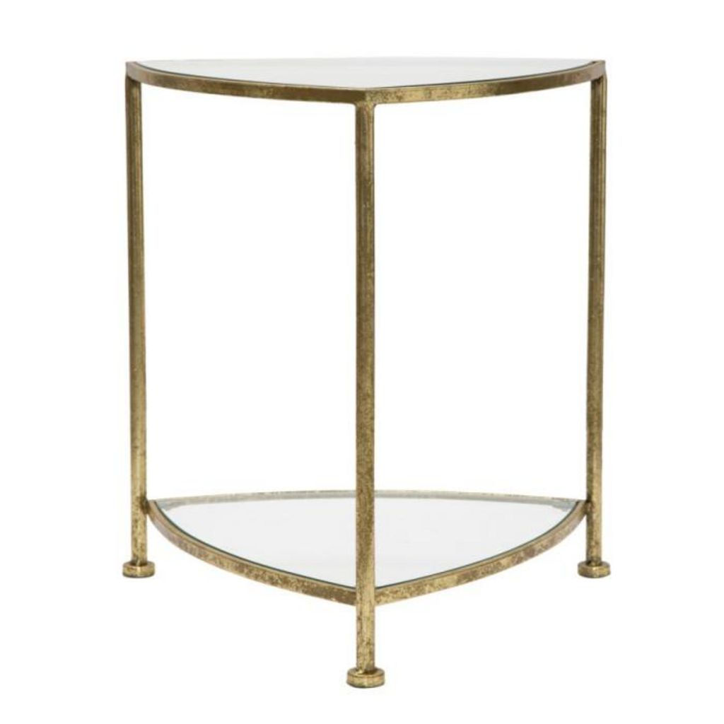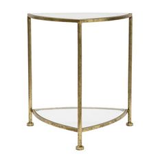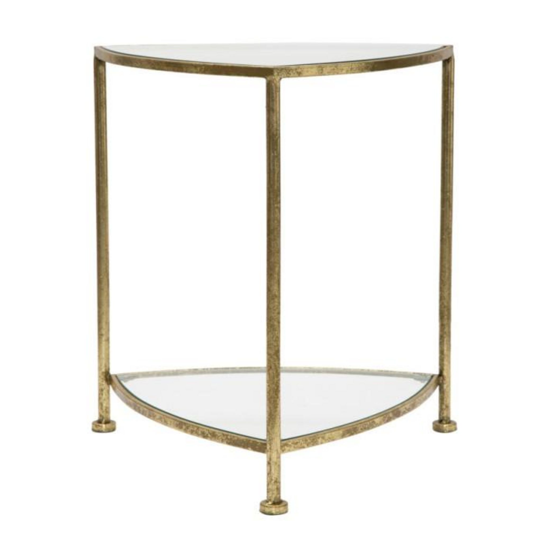 Informations Techniques : Dimensions : L. 45 x l. 45 x H. 50 cm Matières : Plateau : Verre Piètement : Métal Spécificités : Pratique & Design Table d'appoint triangulaire Avec une étagère Plateau en verre transparent Poids : 4,98 kg Couleur : Or