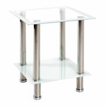 Informations Techniques : Dimensions : L. 40 x P. 40 x H. 46 cm Matières : Acier & Verre Spécificités : Tendance & Moderne Table d'Appoint Design Forme Carrée 2 Plateaux A Monter Soi-Même Facile d'Entretien & d'Utilisation Poids : 3,96 kg Couleur : Blanc & Transparent