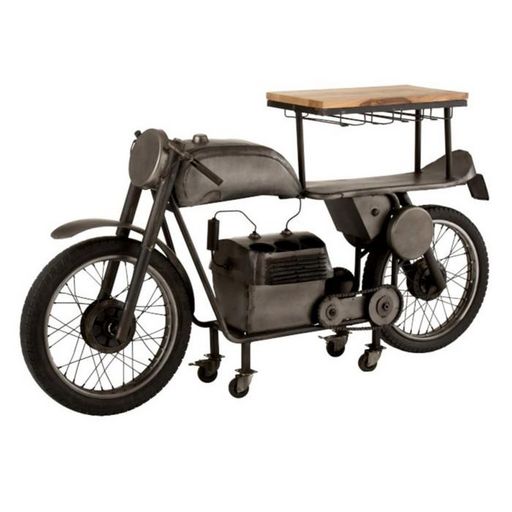 Informations Techniques : Dimensions : L. 200 x l. 43 x H. 100 cm Matière : Bois (Manguier) & Métal Spécificités : Tendance & Contemporain Table de Bar design Forme Motocyclette Peut contenir 12 Verres & 6 Bouteilles Poids : 49 kg Couleur : Gris & Naturel