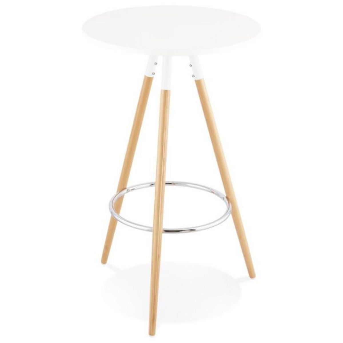 Informations Techniques : Dimensions : L. 65 x l. 65 x H. 101 cm Dimensions de la tablette : 60 cm Épaisseur de la tablette : 1,8 cm Hauteur totale : 101 cm Dimensions de la base : 56 cm entre les pieds Matières : MDF mélaminé Structure & Base : Bois (Hêtre) Spécificités : Repose-pieds en métal chro