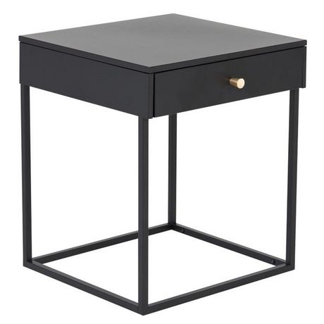 Informations Techniques : Dimensions : L. 43 x l. 41 x H. 50 cm Matière : Acier Spécificités : Élégante & Moderne Table de chevet design Avec un tiroir Revêtement en poudre Nombre de colis : 1 Poids max supporté : 13 kg Poids : 4,5 kg Couleur : Noir