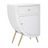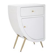 Informations Techniques : Dimensions : L. 60 x l. 32 x H. 79 cm Tiroir : L. 44,5 x l. 27 x H. 11 cm Matières : MDF & Métal Spécificités : Pratique & Originale Table de nuit design Avec 1 porte et 1 tiroir Finitions dorées Poids : 14,2 kg Couleur : Blanc & Or