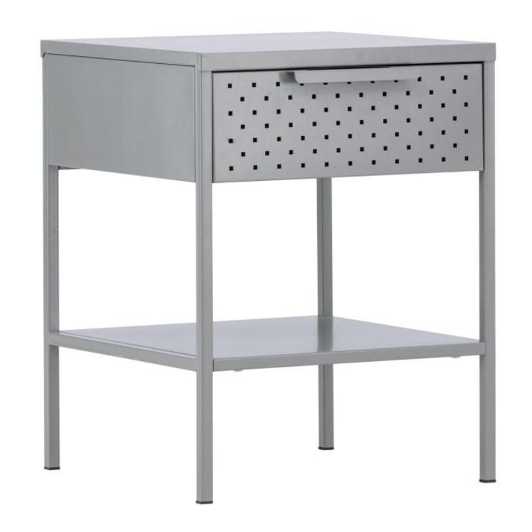 Informations Techniques : Dimensions : L. 40 x l. 40 x H. 52 cm Matière : Acier Spécificités : Moderne & Épurée Table de chevet carrée Avec 1 tiroir et 1 étagère Revêtement en poudre époxy Nombre de colis : 1 Poids max supporté : 10 kg Poids : 5,5 kg Couleur : Gris Clair