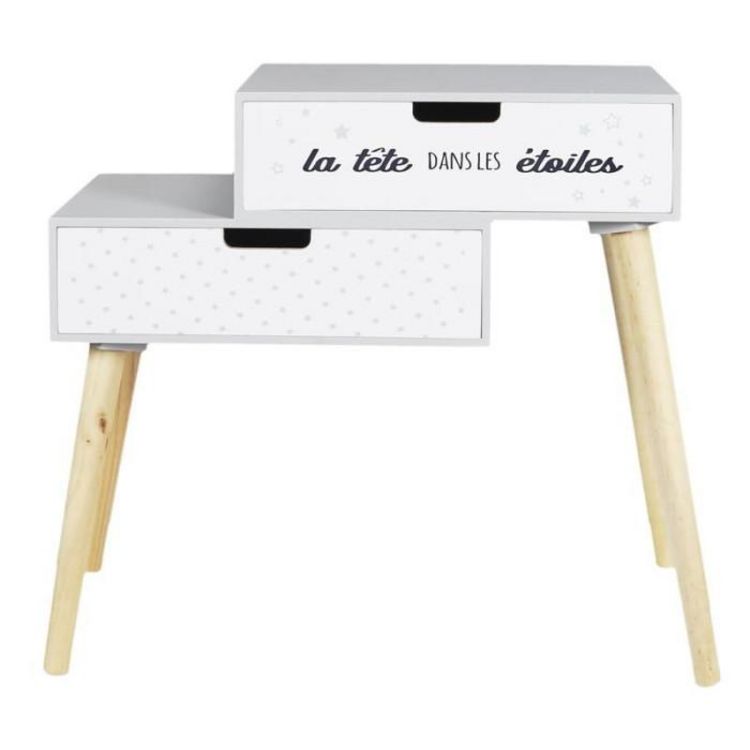 Informations Techniques : Dimensions : L. 54,5 x l. 21,5 x H. 51 cm Matière : Bois Spécificités : Pratique & Utile Table de Chevet Pour Enfant 2 Tiroirs A Motifs Facile d'utilisation Couleur : Gris