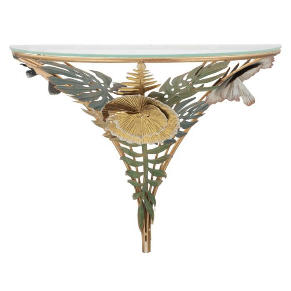 Informations Techniques : Dimensions : L. 44,5 x l. 24,5 x H. 34,5 cm Matières : Plateau : Verre Piètement : Métal Spécificités : Pratique & Déco Table de chevet mural design Plateau en verre transparent Ornement feuilles tropicales Forme demi-cercle Poids : 1,84 kg Couleur : Multicolore