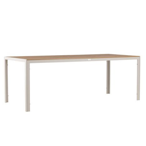 Informations Techniques : Dimensions : L. 205 x l. 90 x H. 74 cm Plateau : H. 3,7 cm Matières : Aluminium & Polystyrène Spécificités : Moderne & Robuste Table d'extérieur rectangulaire Idéal pour 8 convives Plateau aspect bois Couleur : Beige & Naturel
