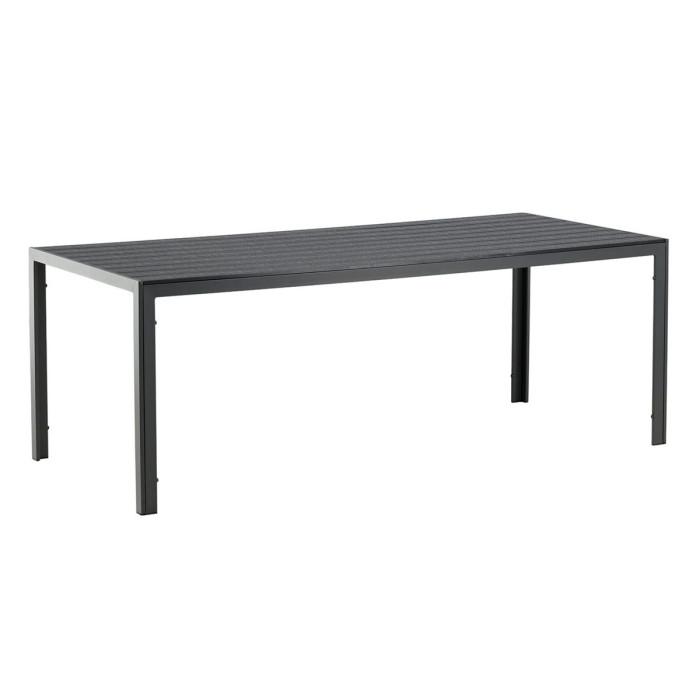Informations Techniques : Dimensions : L. 205 x l. 90 x H. 74 cm Plateau : H. 5,5 cm Matières : Aluminium & Polystyrène Spécificités : Robuste & Moderne Table d'extérieur rectangulaire Jusqu'à 8 convives Plateau aspect bois Revêtement en poudre Poids : 22,7 kg Couleur : Noir