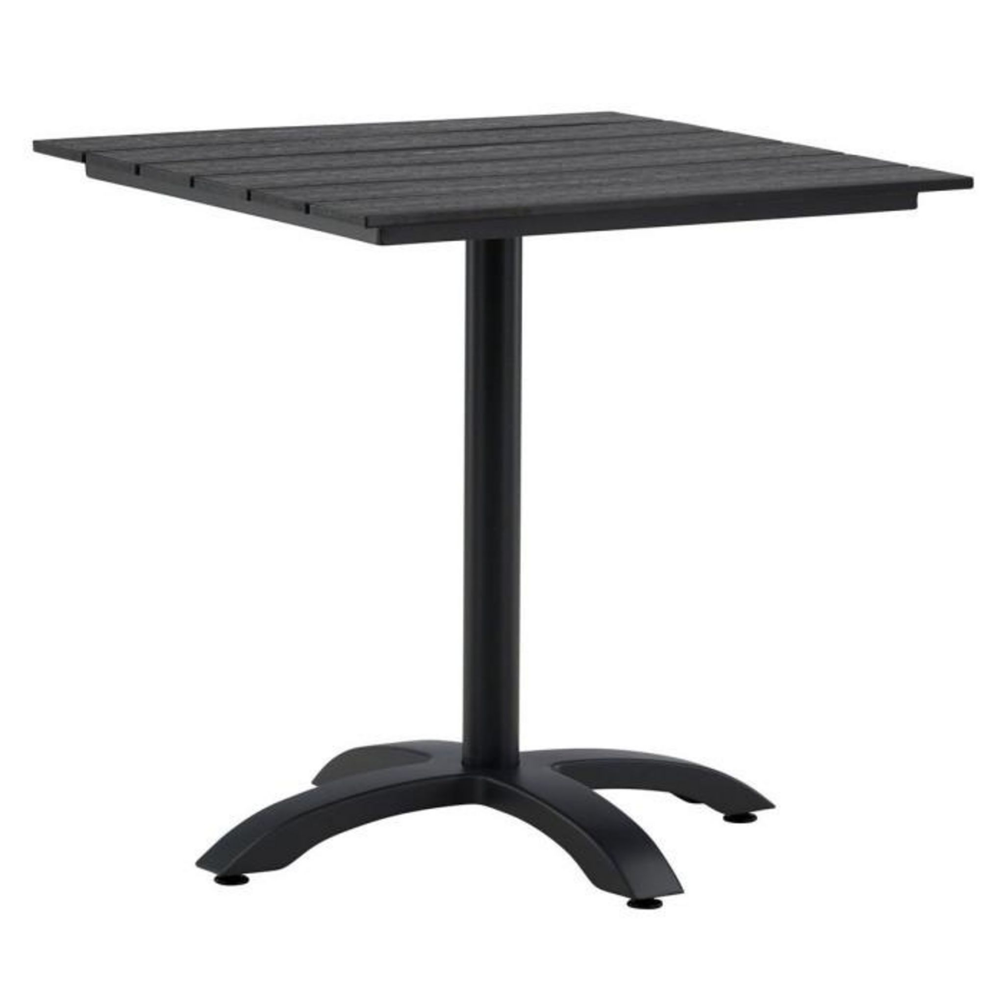 Informations Techniques : Dimensions : L. 70 x l. 70 x H. 74 cm Plateau : H. 2,5 cm Matières : Aluminium & Polystyrène Classique & Durable Table d'extérieur carrée Plateau aspect bois Poids max supporté : 100 kg Poids : 11 kg Couleur : Noir