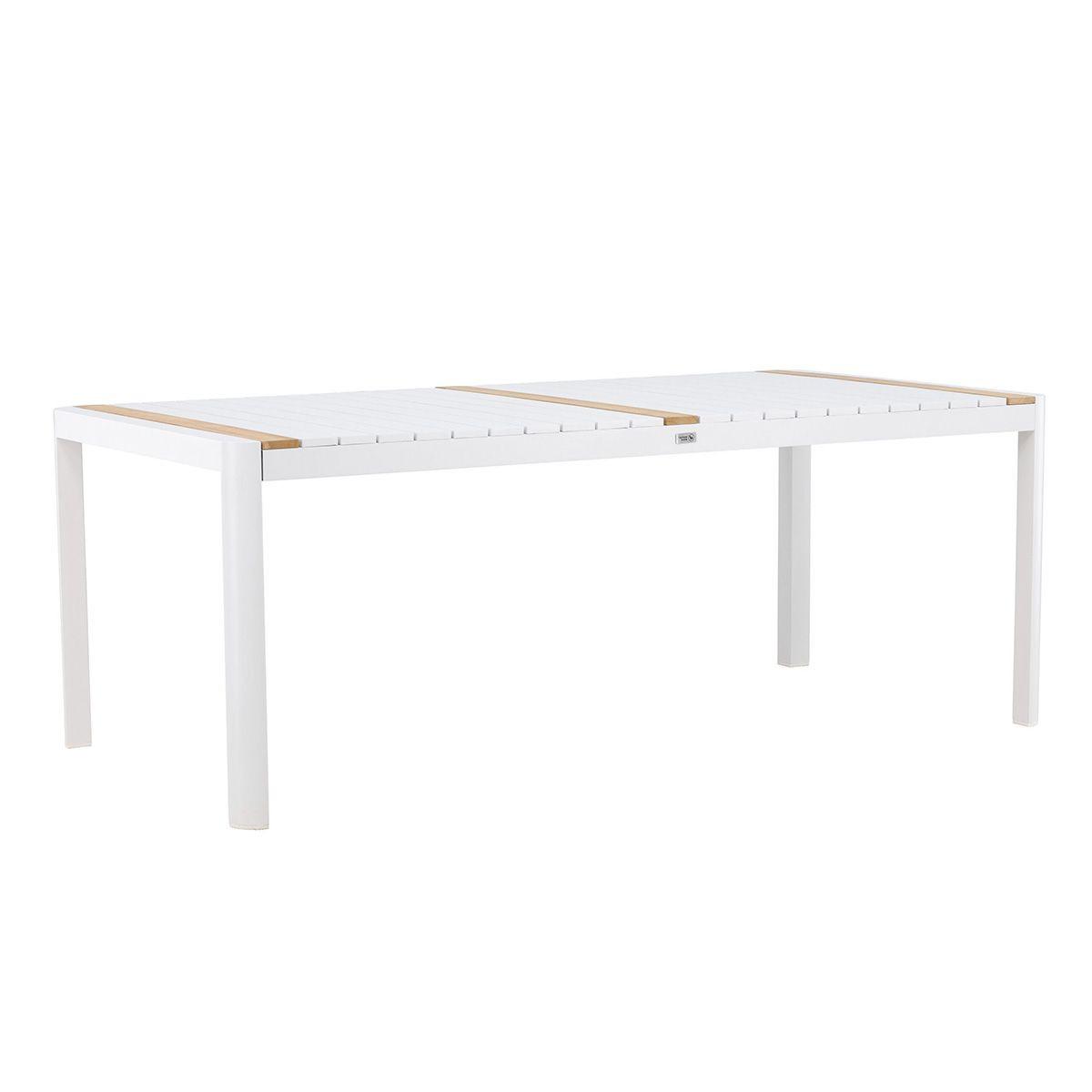 Informations Techniques : Dimensions : L. 200 x l. 100 x H. 75 cm Plateau : H. 2 cm Matières : Bois (Teck) & Aluminium Spécificités : Élégante & Intemporelle Table d'extérieur rectangulaire Jusqu'à 6/8 convives Poids max supporté : 150 kg Poids : 28 kg Couleur : Blanc & Naturel