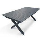 Informations Techniques : Dimensions : L. 180-240 x l. 100 x H. 77 cm Matière : Aluminium Spécificités : Pratique & Utile Table d'extérieur extensible Jusqu'à 10 convives Rallonge automatique Piètement croisé Nombre de colis : 1 Poids : 32 kg Couleur : Gris Anthracite