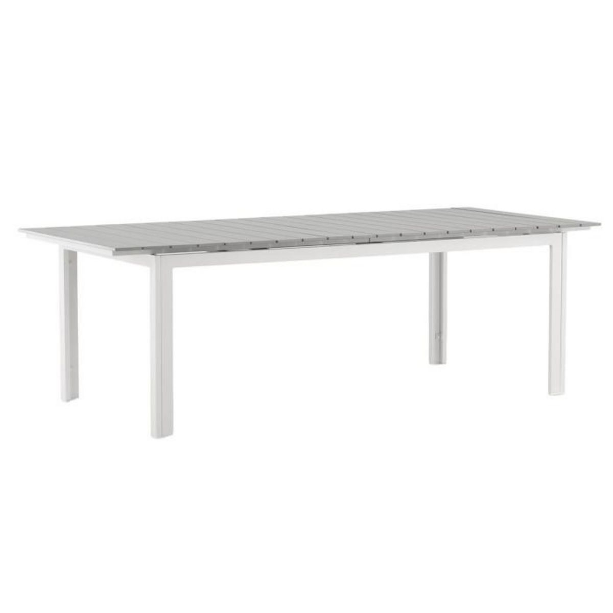 Informations Techniques : Dimensions : L. 229-310 x l. 100 x H. 75 cm Plateau : H. 2 cm Matières : Aluminium & Polystyrène Spécificités : Élégante & Pratique Table d'extérieur extensible Jusqu'à 6 convives (sans extension) Plateau aspect bois Revêtement enrobage Poids max supporté : 150 kg Poids : 4