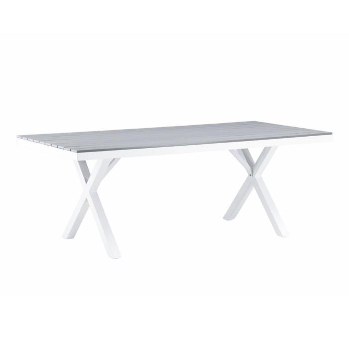 Informations Techniques : Dimensions : L. 200 x l. 100 x H. 74 cm Plateau : H. 1,4 cm Matières : Aluminium & Polystyrène Spécificités : Moderne & Élégante Table d'extérieur Jusqu'à 6 convives Plateau effet bois Poids max supporté : 80 kg Poids : 25,3 kg Couleur : Gris & Blanc