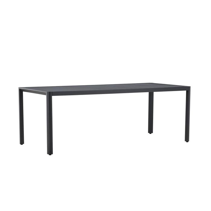 Informations Techniques : Dimensions : L. 200 x l. 90 x H. 72 cm Plateau : H. 5 cm Matière : Aluminium Spécificités : Pratique & Robuste Table à manger d'extérieur Plateau nervuré Résistante aux intempéries Poids : 13,5 kg Couleur : Noir