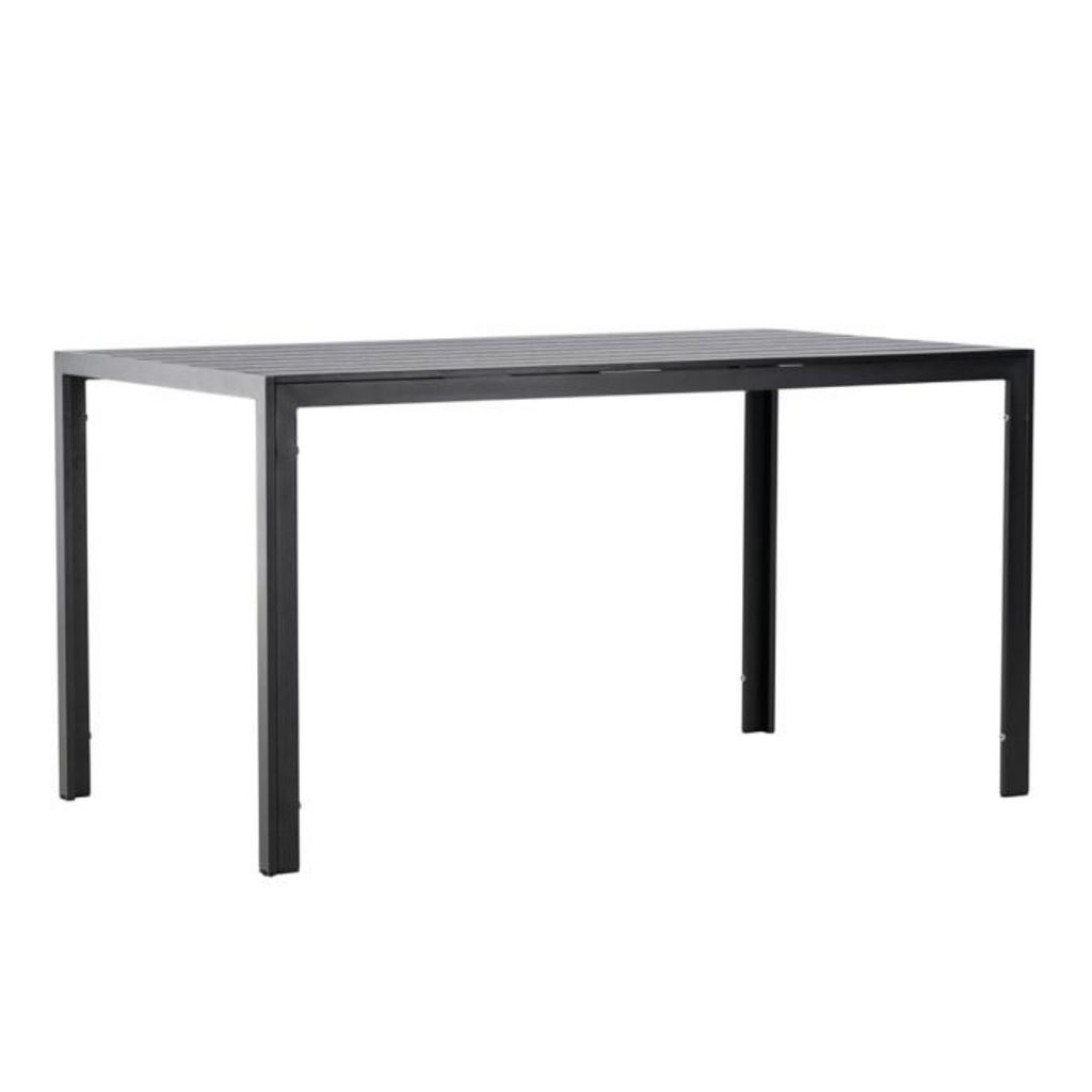 Informations Techniques : Dimensions : L. 140 x l. 80 x H. 74 cm Plateau : H. 1,2 cm Matières : Aluminium & Bois (Contreplaqué) Spécificités : Élégante & Robuste Table à manger d'extérieur Plateau rectangulaire Poids max supporté : 60 kg Poids : 14 kg Couleur : Noir